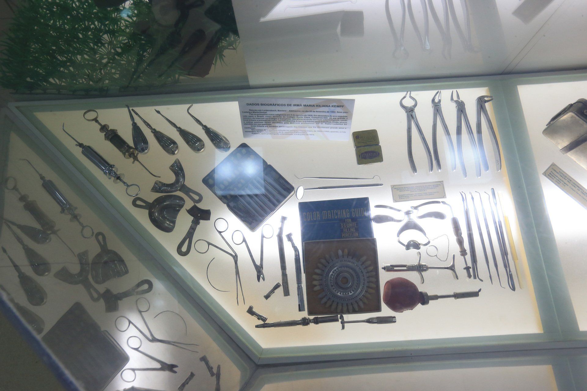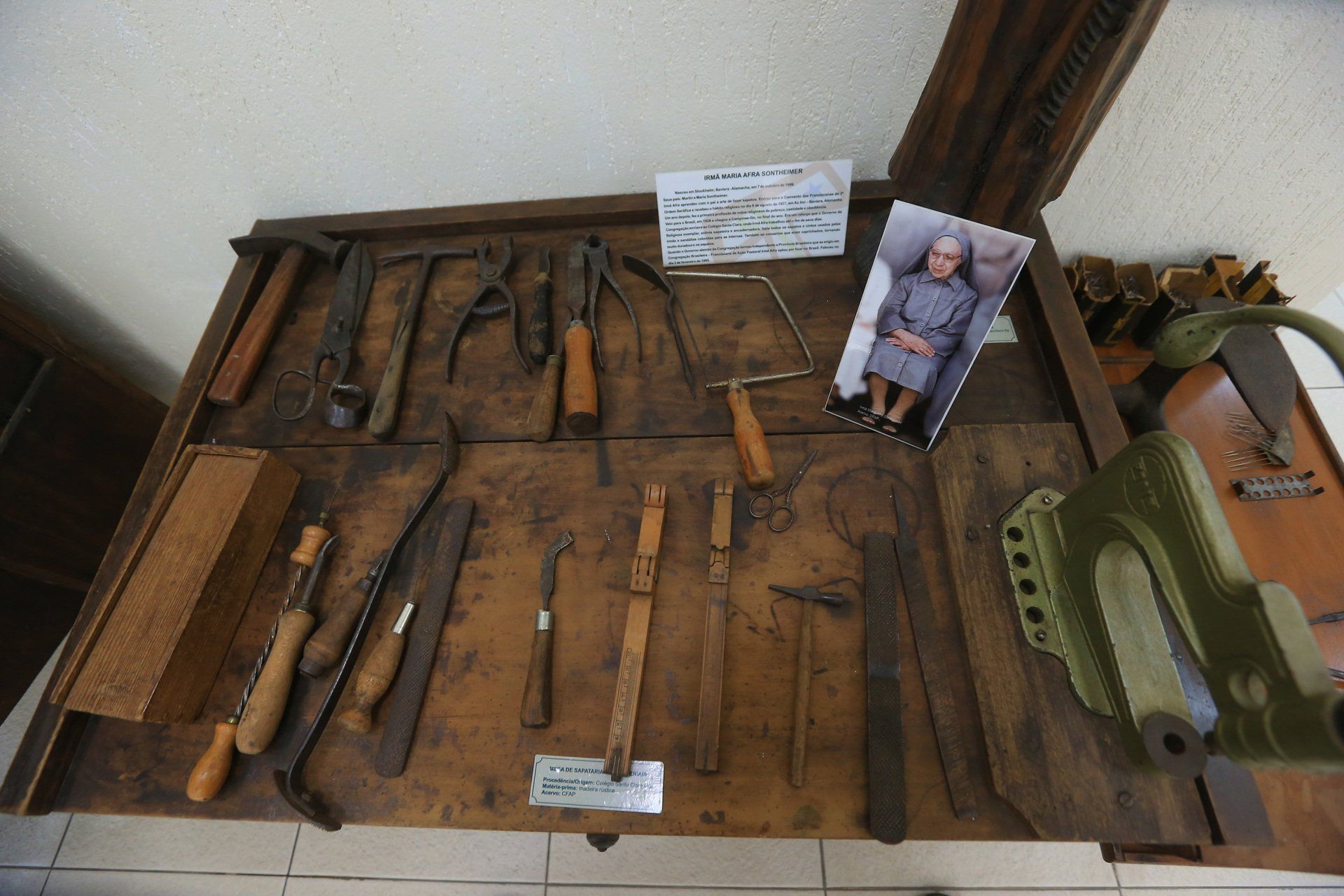 De um lado, é possível ver as ferramentas de marcenaria usadas pela irmã Maria Afra Sontheimer para fazer os sapatos das alunas do Santa Clara. A alemã aprendeu com o pai a confeccionar calçados e tornou-se exímia sapateira e encadernadora. No outro canto do museu, o público pode conferir instrumentos odontológicos usados na época pela irmã Maria Kiliana Kempf para tratar a comunidade. “Imagine só, quando elas chegaram na região não havia quase nada”, explica irmã Nathalia.