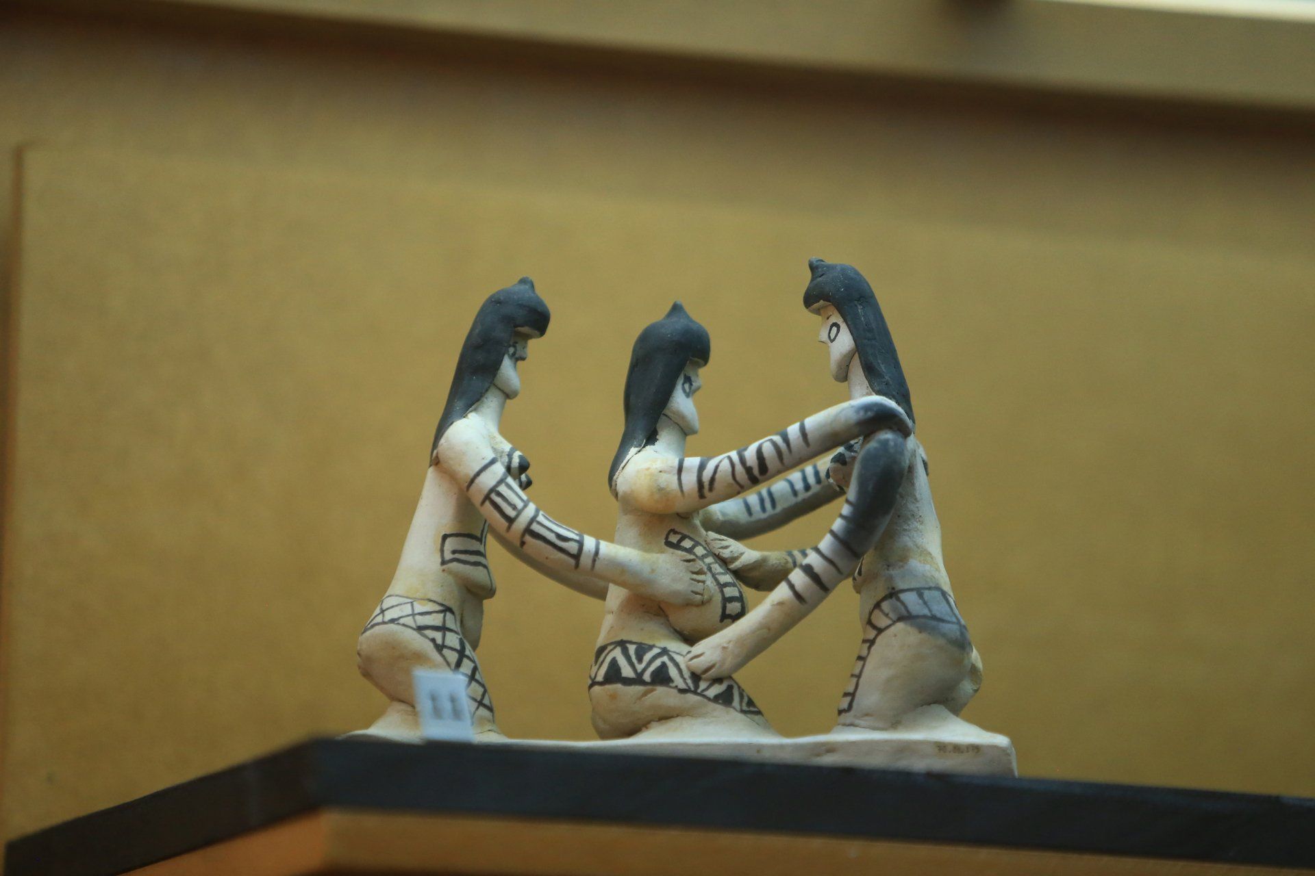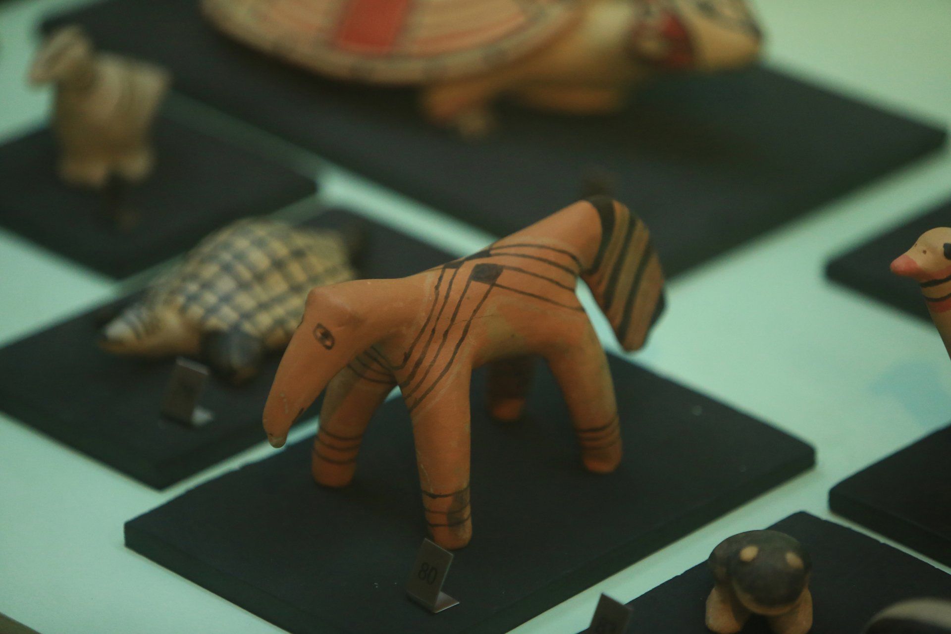 As cerâmicas carajás registram cenas do cotidiano imaginadas e realizadas por esse grupo indígena. Na vitrine, diversas formas de trabalho e da vida cotidiana da aldeia, como cena de parto, cena de enterro e outras, são mostradas.