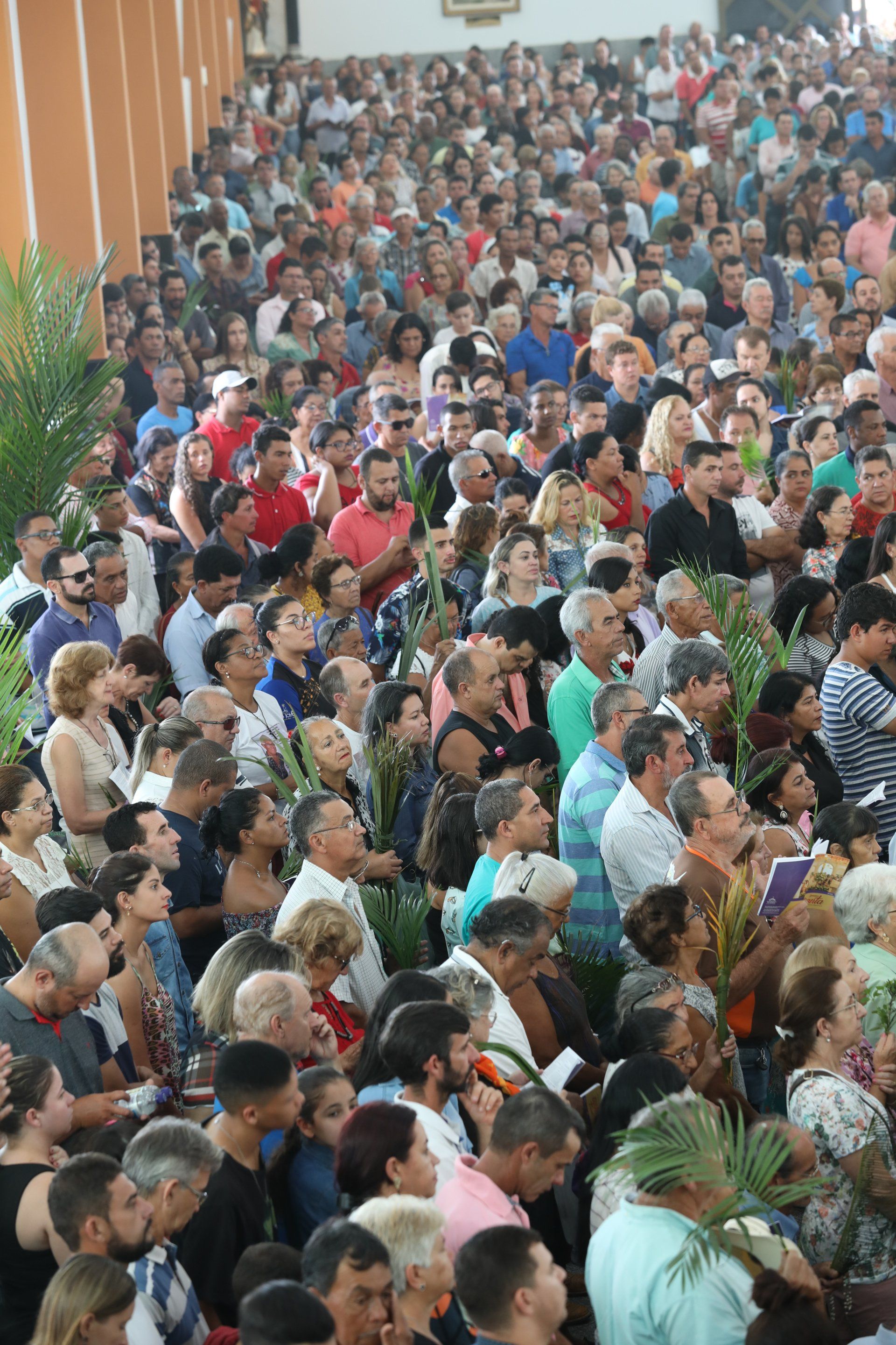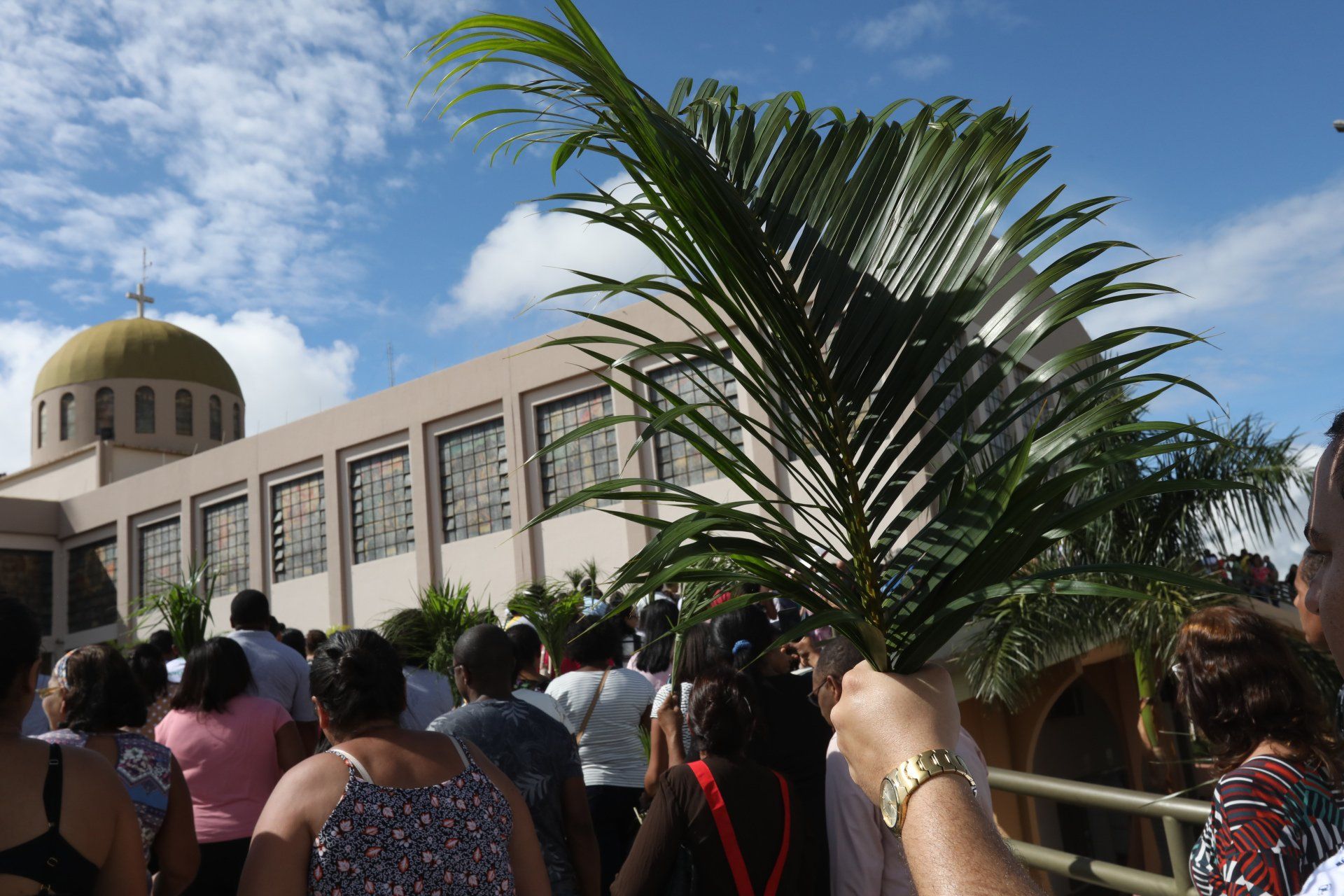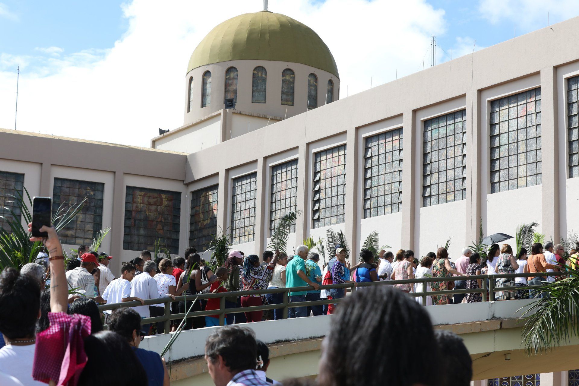 Na igreja lotada de fieis, boa parte deles segurando folhas de palmeiras, não há mais lugar para se sentar. Mariana Cândida de Jesus, 68 anos, e sua cunhada Maria Cândida de Araújo, 76, ficam de pé em um dos corredores do Santuário Basílica do Divino Pai Eterno, em Trindade...