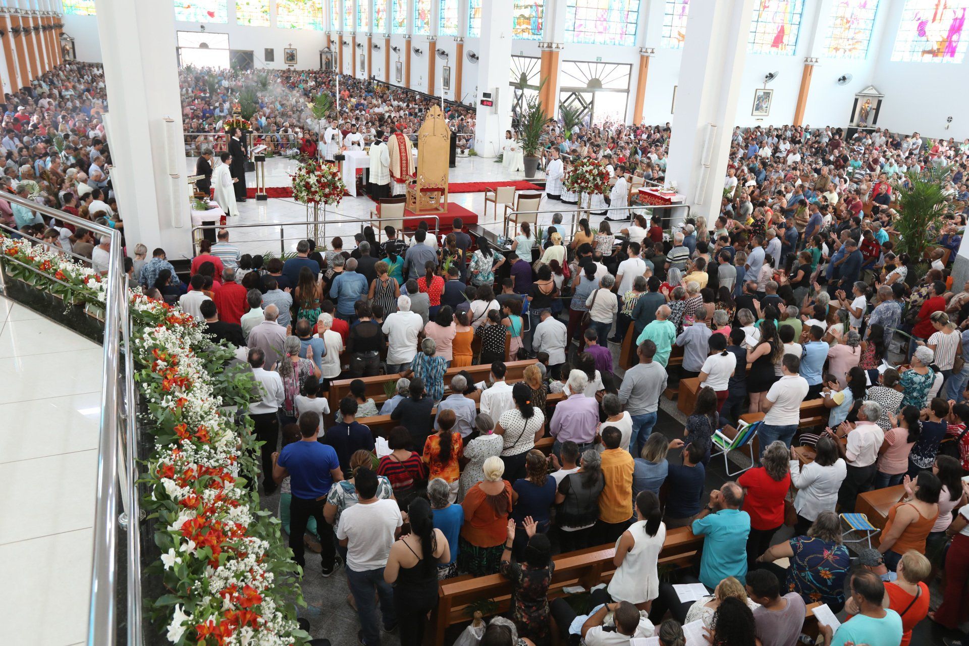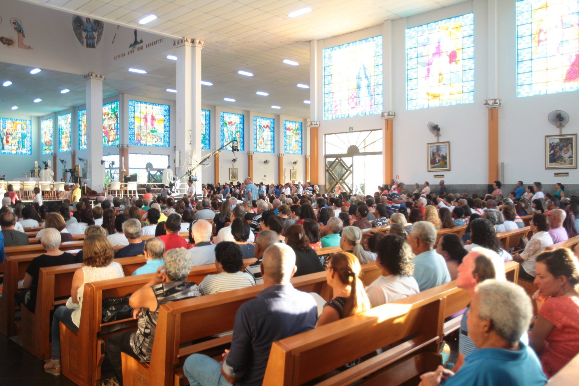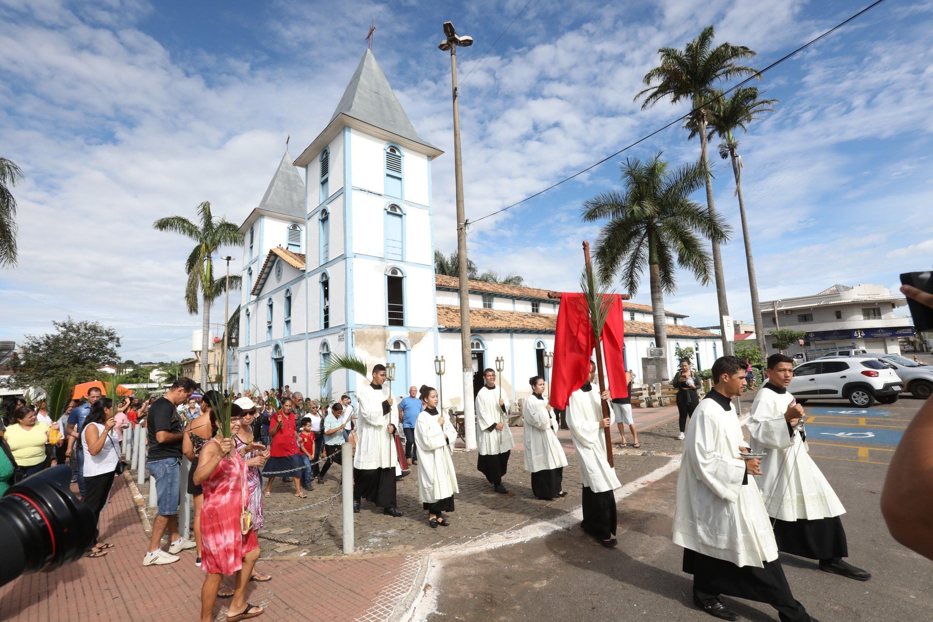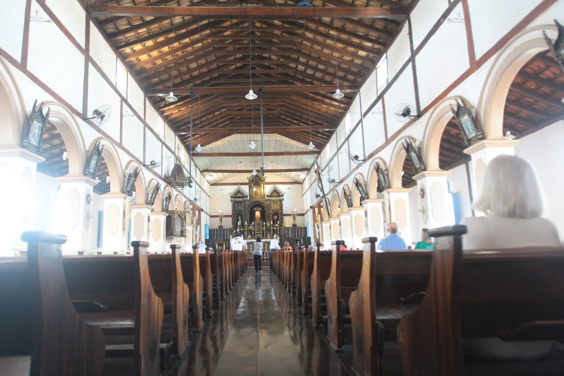 Na igreja lotada de fieis, boa parte deles segurando folhas de palmeiras, não há mais lugar para se sentar. Mariana Cândida de Jesus, 68 anos, e sua cunhada Maria Cândida de Araújo, 76, ficam de pé em um dos corredores do Santuário Basílica do Divino Pai Eterno, em Trindade...